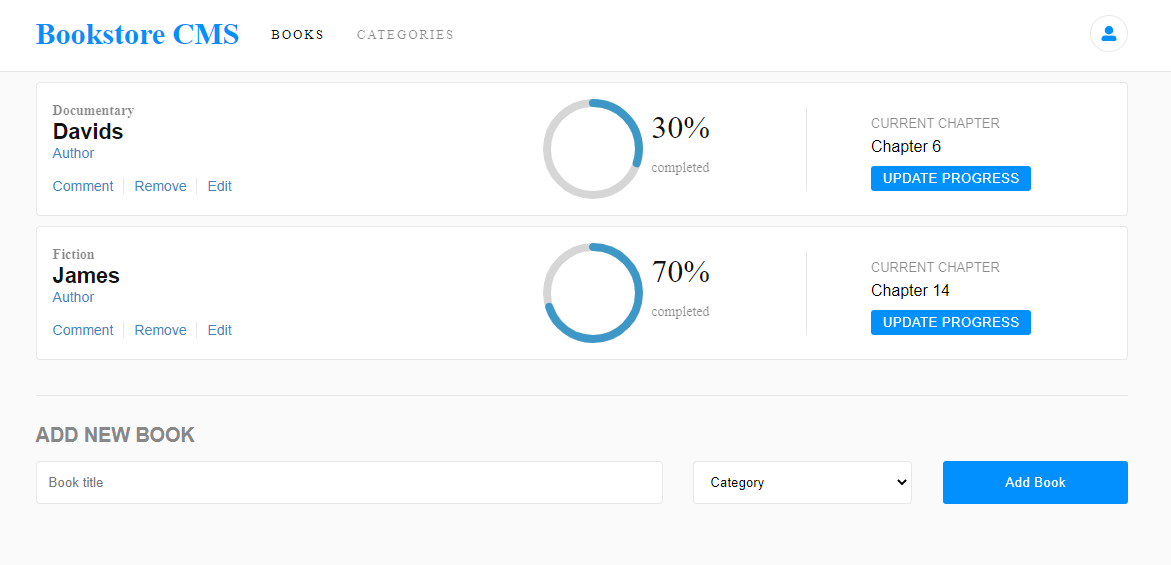 The Bookstore is an application for displaying a list of books, adding a book, and removing a selected book. I built this application using React and Redux and a remote API to fetch and display books with their corresponding categories.The Bookstore is an application for displaying a list of books, adding a book, and removing a selected book. I built this application using React and Redux and a remote API to fetch and display books with their corresponding categories.