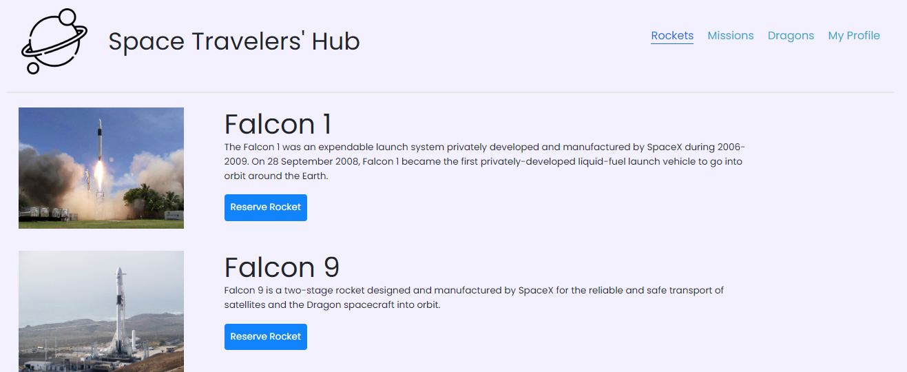 The Space Travelers' Hub is a React app built with, components, hooks, state, redux, and run tests. It consists of Rockets, Missions, and the My Profile section.